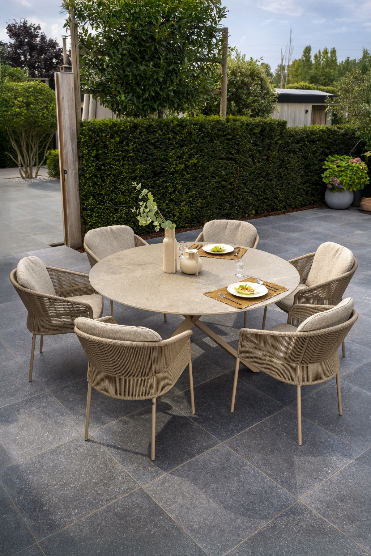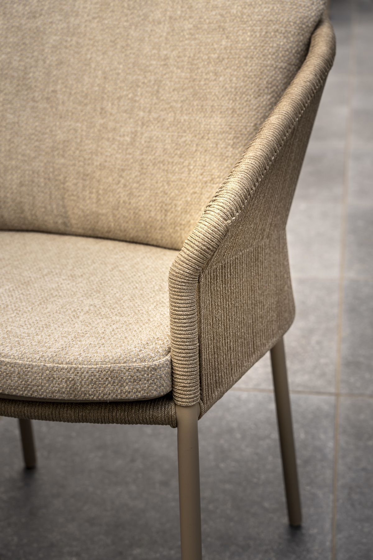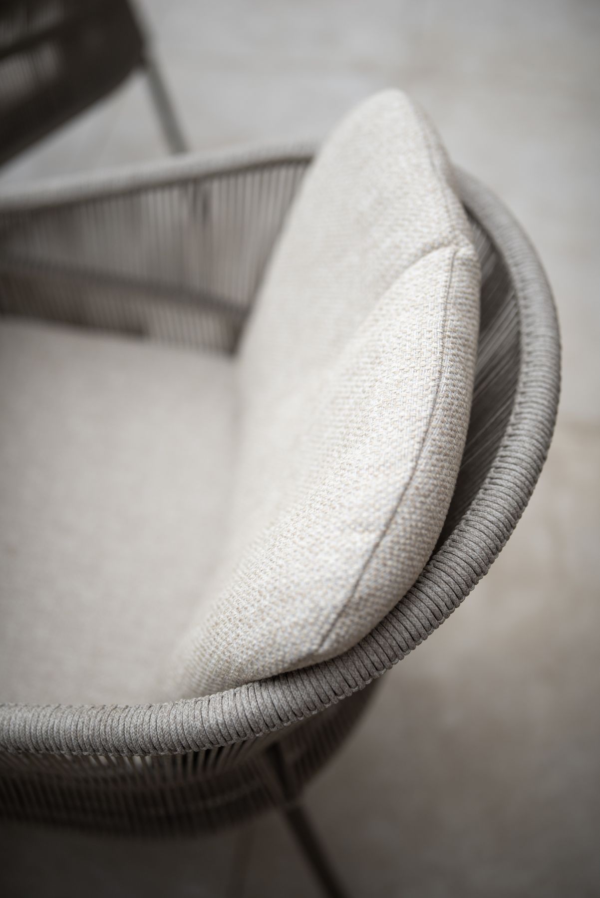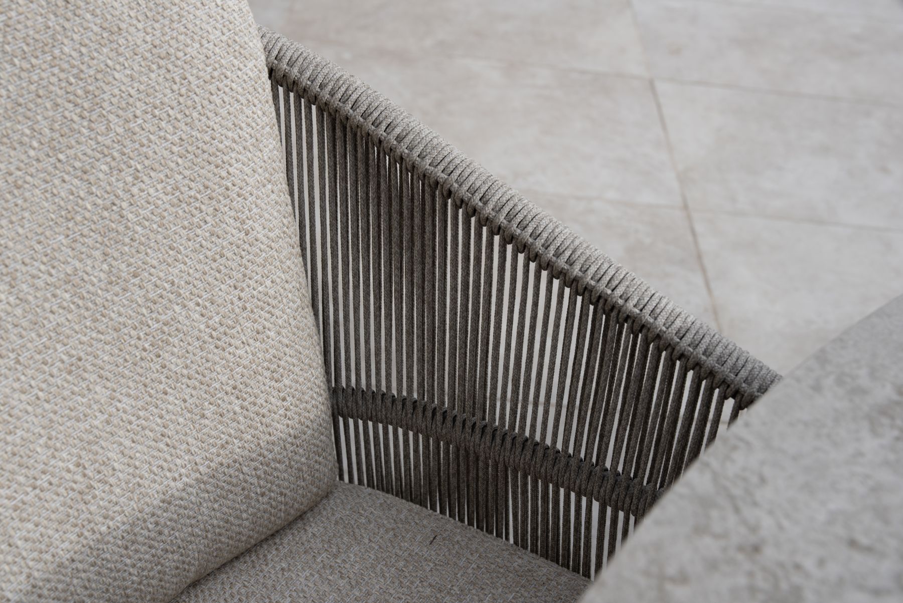 Podstawę mebla stanowi solidna rama z aluminium malowanego proszkowo. Oparcie i podłokietniki wykończono gęstym, ciasno plecionym wzorem ze sznura (Rope).