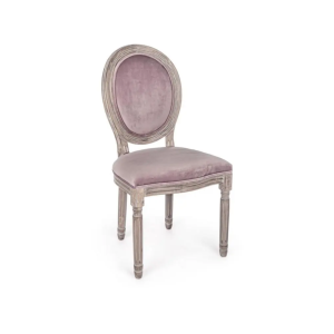 Rama krzesła wykonana jest z litego drewna brzozowego, cenionego za wytrzymałość i stabilność, typową dla stylu klasycznego. Siedzisko i oparcie są wyściełane (Padded), a całość pokrywa luksusowy welur (poliester z efektem aksamitnym). Krzesło charakteryzuje się eleganckim, owalnym kształtem oparcia.