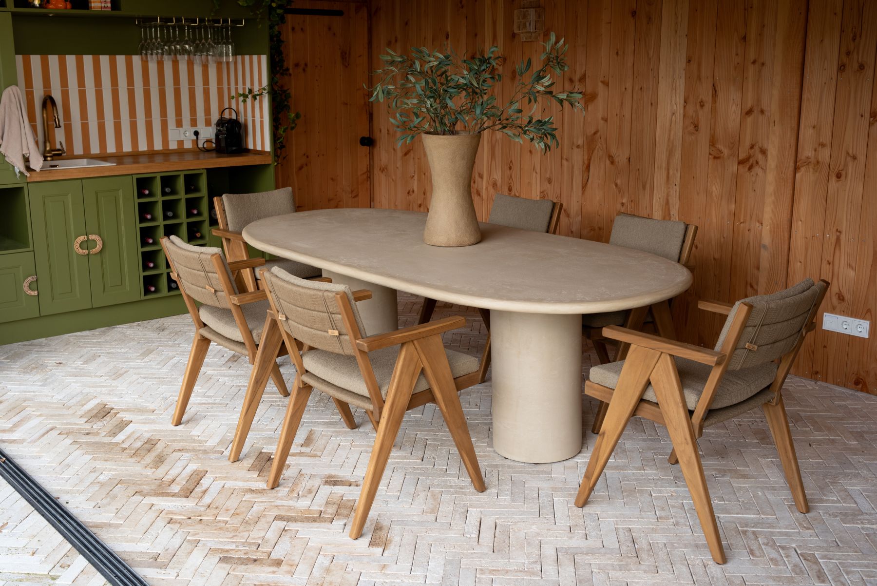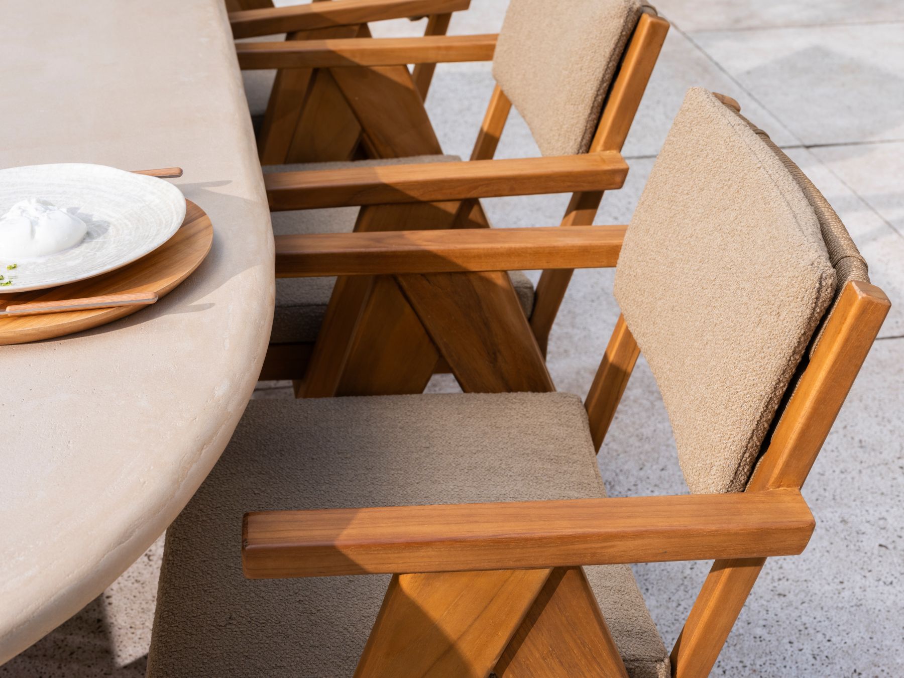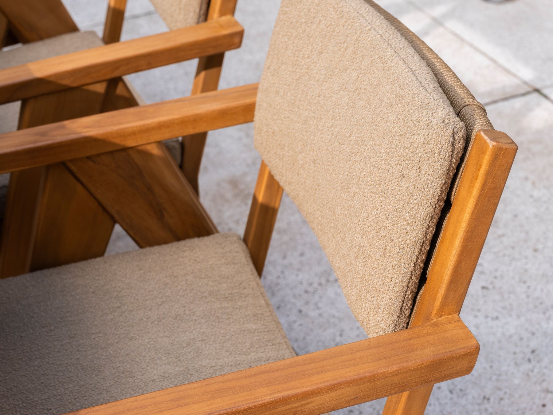 Krzesło Mats Teak to propozycja dla miłośników naturalnego luksusu. Model ten łączy solidną ramę z drewna tekowego z nowoczesną, tekstylną elegancją. Ciepła barwa drewna doskonale współgra z tapicerką w odcieniu Bouclé Amber (piaskowy bursztyn), tworząc mebel o ponadczasowym, organicznym charakterze.