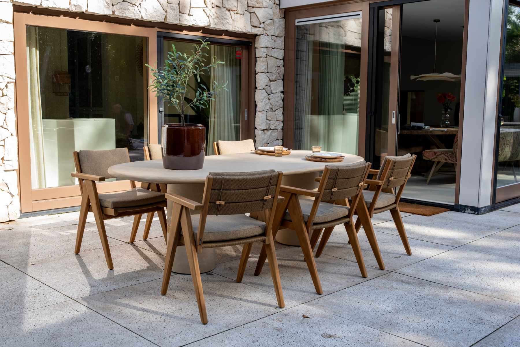 Podstawę krzesła stanowi rama wykonana z naturalnego drewna tekowego (Teak). Jest to surowiec ceniony za swoją wyjątkową twardość i wysoką zawartość naturalnych olejów, co czyni go odpornym na wilgoć i zmienne warunki pogodowe. Konstrukcję uzupełniają detale ze sznura (Rope) w kolorze brązowym.