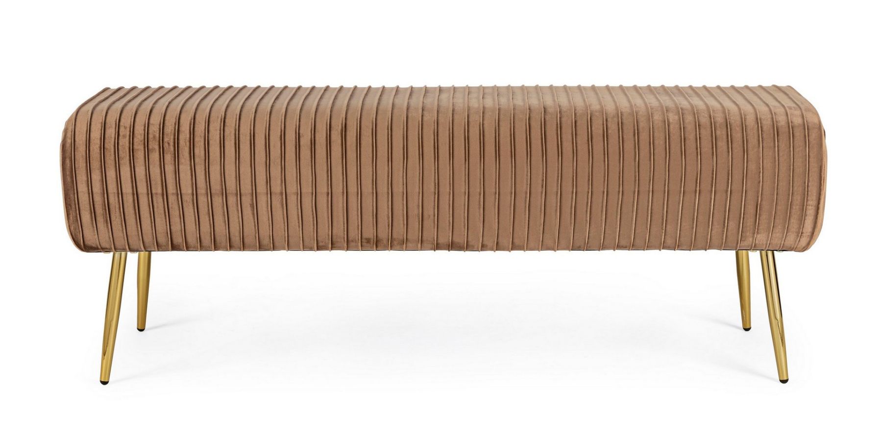 Ławka SELENA to luksusowe siedzisko, które łączy solidną konstrukcję z blaskiem chromowanego złota i modną tkaniną sztruksową (ryflowaną) w stylu Glamour.