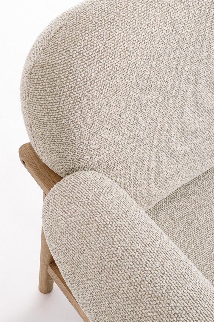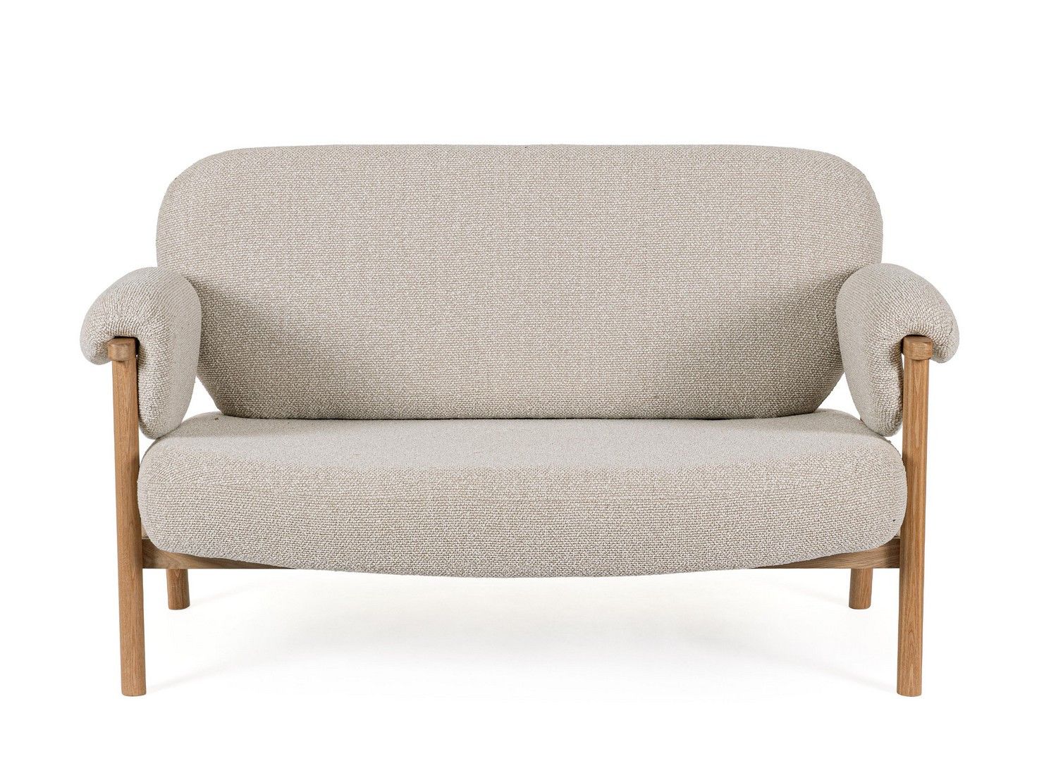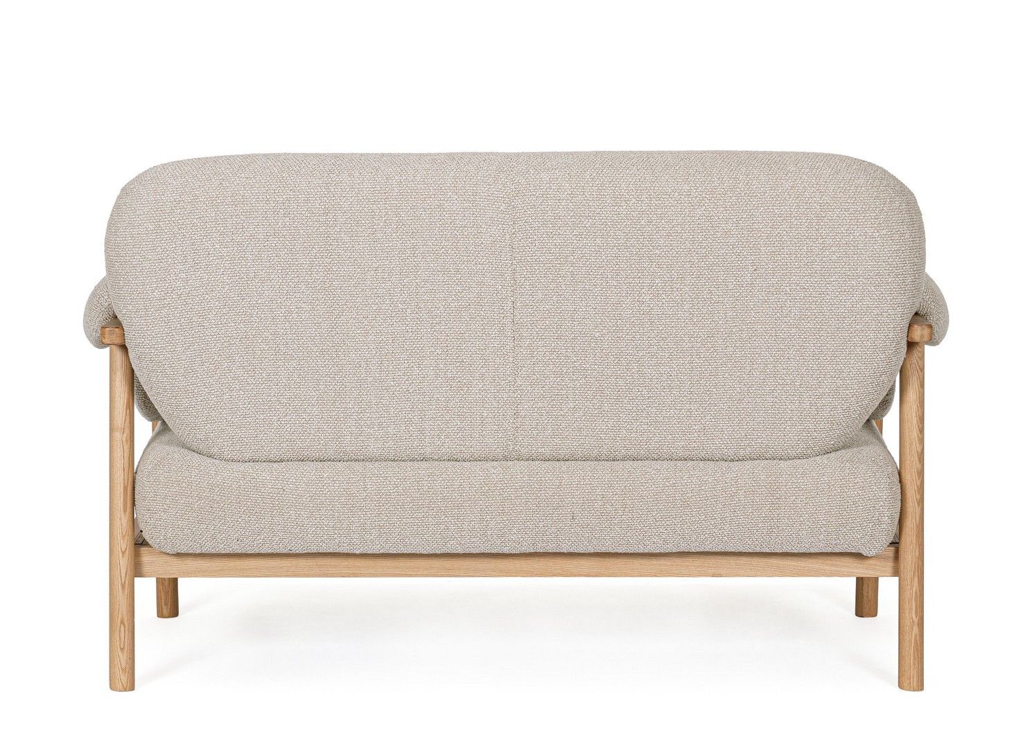Mebel ma solidny stelaż z drewna brzozowego, który jest wyeksponowany i nadaje sofie ciepłego, naturalnego charakteru. Siedzisko i oparcie pokrywa miękka, teksturowana tkanina poliestrowa w kolorze Naturalnego Beżu.
