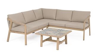 Zestaw narożny KALIMERA to luksusowa propozycja outdoor, która łączy ciepłą estetykę drewna z porcelanowym blatem stolika i bezkompromisową trwałością wodoodpornych poduszek.