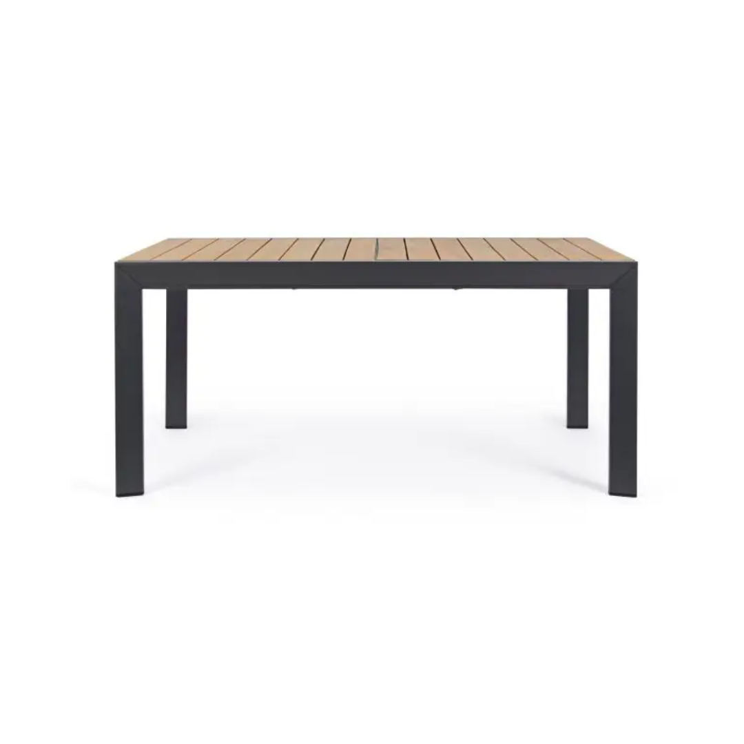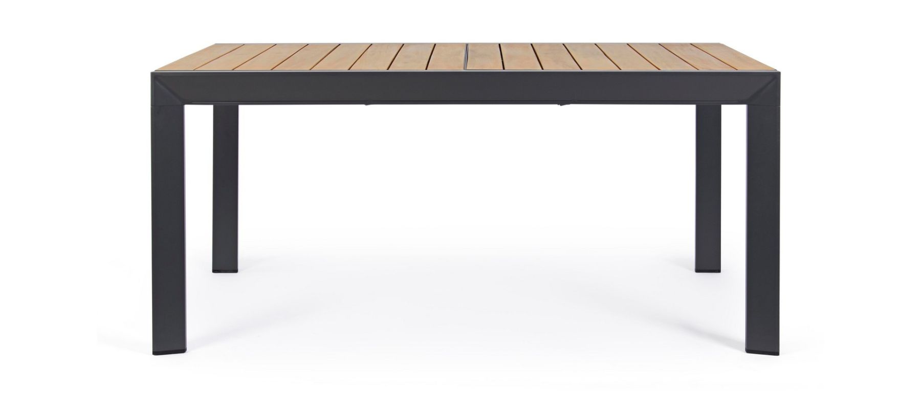 Blat wykonany z aluminiowych listew z malowaniem w efekcie naturalnego drewna doskonale imituje strukturę i kolor prawdziwego surowca, a przy tym nie wymaga żadnej konserwacji. Dzięki funkcji rozkładania stół można powiększyć z 160 cm do 240 cm, co pozwala na wygodne spotkania w większym gronie.