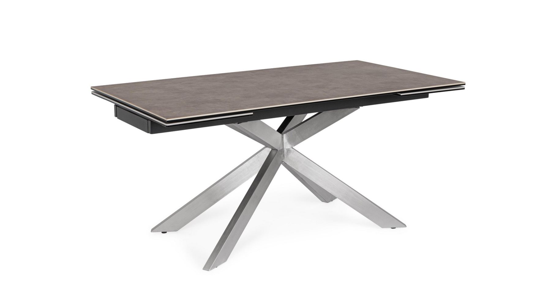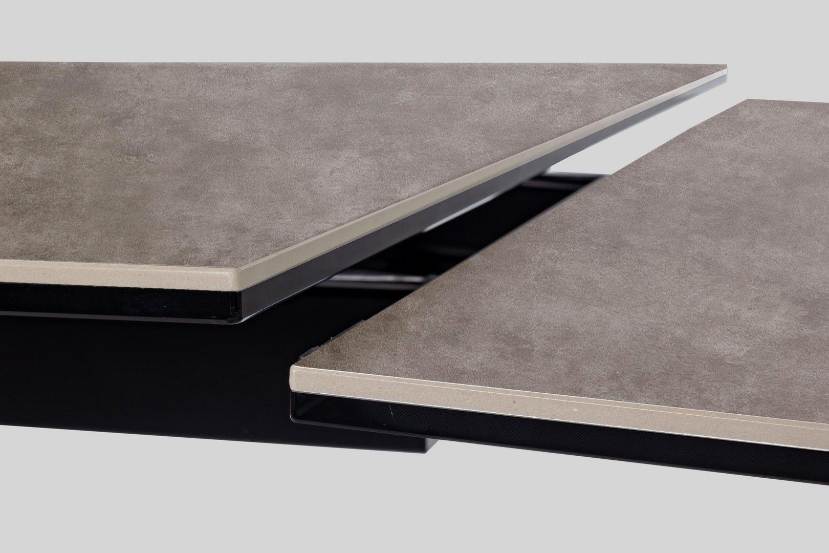 Stół Arzachel od włoskiego producenta Bizzotto to propozycja dla miłośników nowoczesnego designu i praktycznych rozwiązań. Blat z ceramiki (5 mm) wzmocniony szkłem hartowanym (8 mm) zachwyca eleganckim wykończeniem z efektem kamienia w odcieniach brązu i grafitu, tworząc luksusowy, ale stonowany akcent w przestrzeni jadalni.