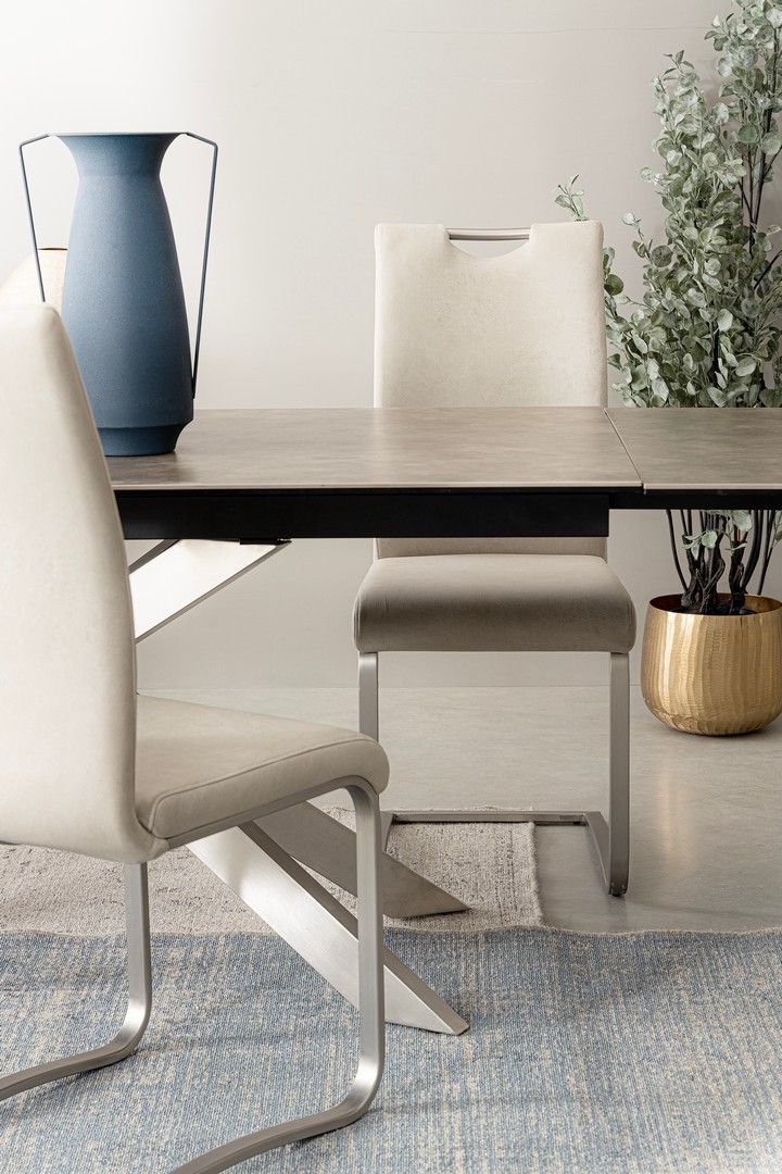 Stabilna rama i nogi ze stali nierdzewnej w kolorze srebrnym nadają całości lekkości i nowoczesnego charakteru, a jednocześnie gwarantują trwałość i odporność na codzienne użytkowanie. Stół posiada niezależny mechanizm rozkładania z obu stron, który pozwala w prosty sposób dopasować jego długość do liczby gości - od 160 do aż 240 cm.