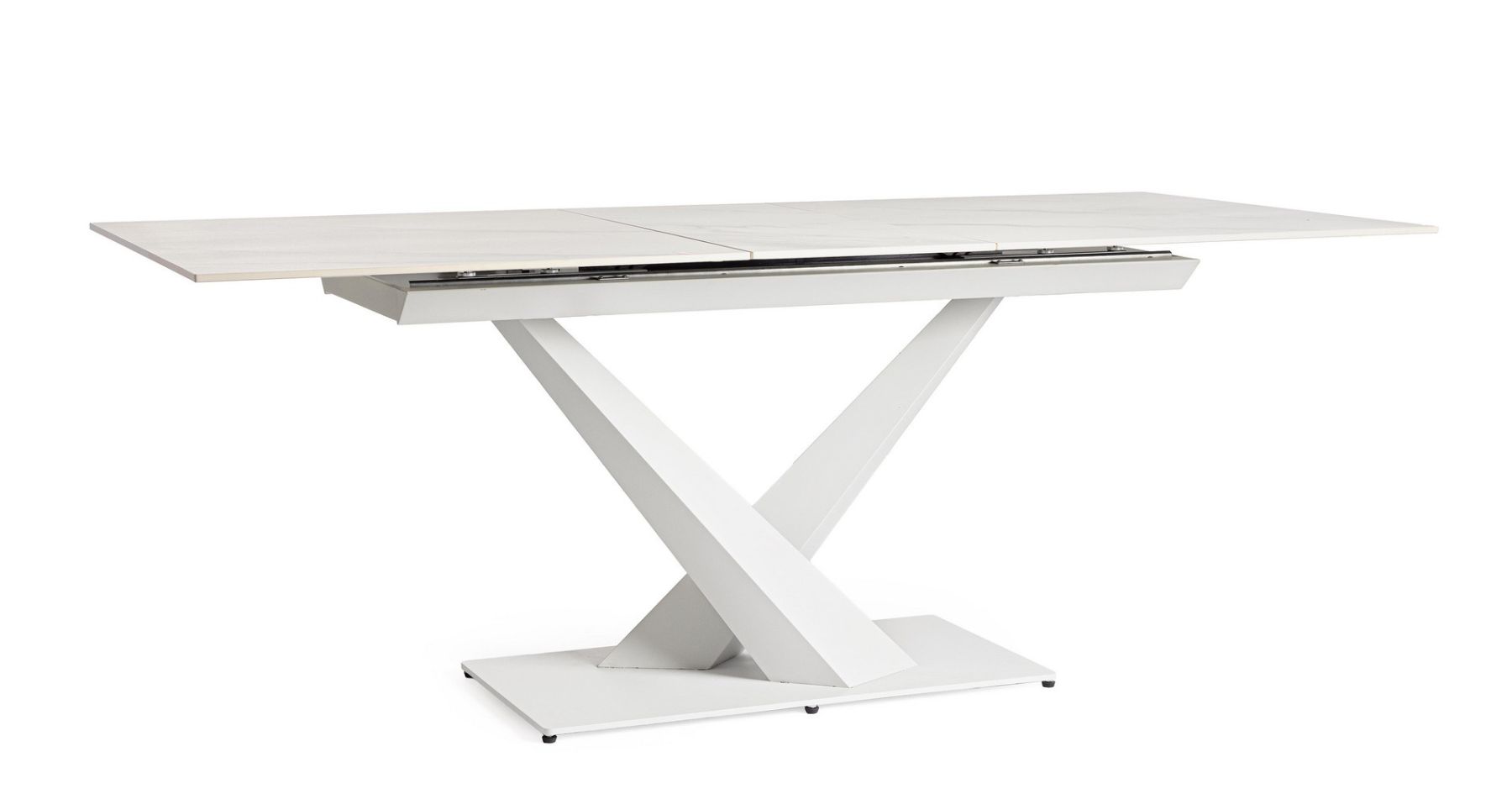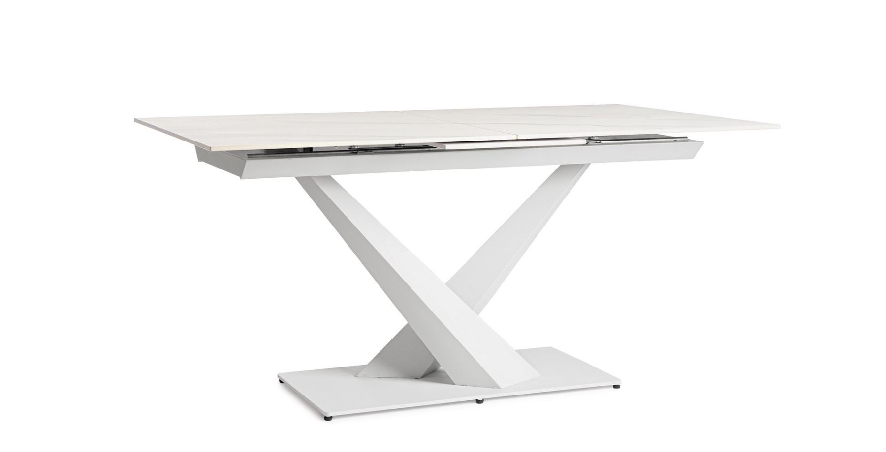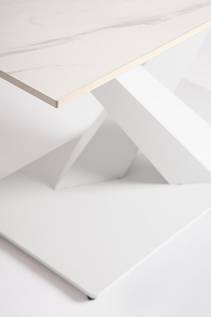 White -stalowa podstawa w kolorze białym i blat z porcelanowego gresu w efekcie białego marmuru.