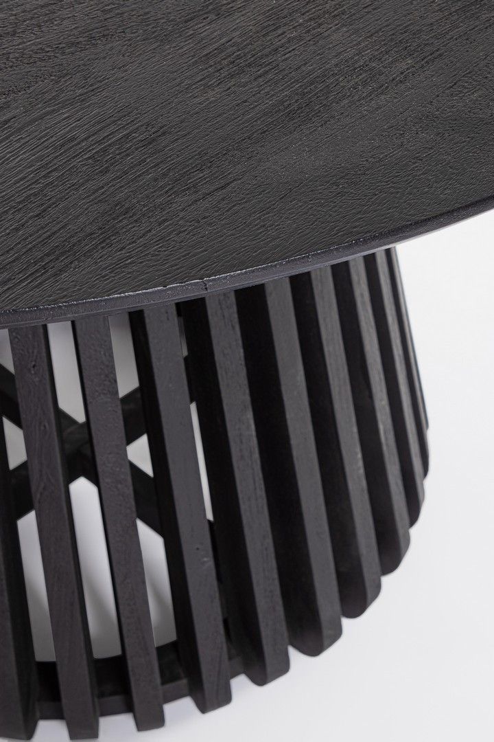 Stół Odion Black od włoskiego producenta Bizzotto łączy naturalne piękno drewna z nowoczesnym designem. Blat o średnicy 130 cm i konstrukcja wykonane są z litego drewna mango, wykończonego powłoką na bazie nitrocelulozy, która podkreśla strukturę drewna i zapewnia trwałość.