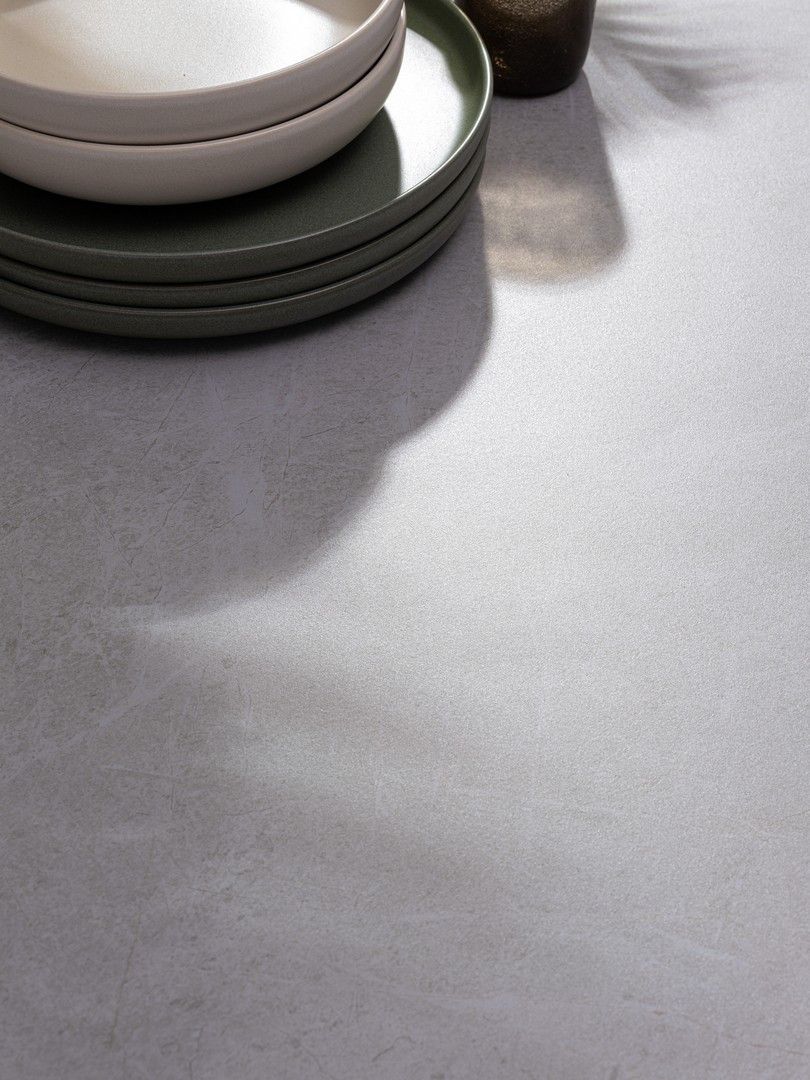 blat z kamienia spiekanego (grubość 11 mm) w eleganckim, szarym odcieniu,