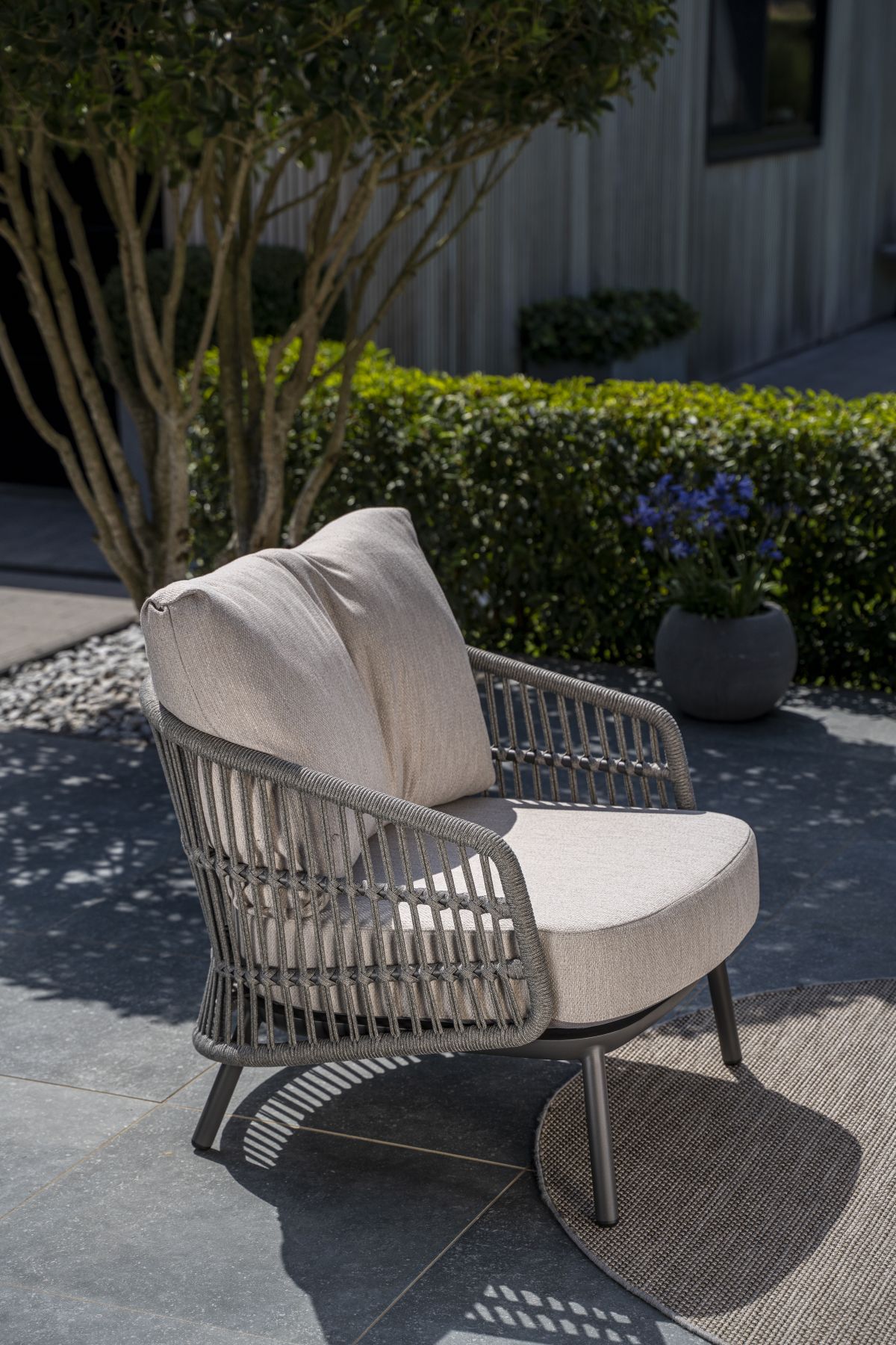 Ramę mebli wykonano z aluminium malowanego proszkowo w kolorze Antracyt (ciemny szary). Konstrukcja jest opleciona sznurem (Rope) w kolorze szarym, który tworzy ażurowe, przewiewne oparcie.