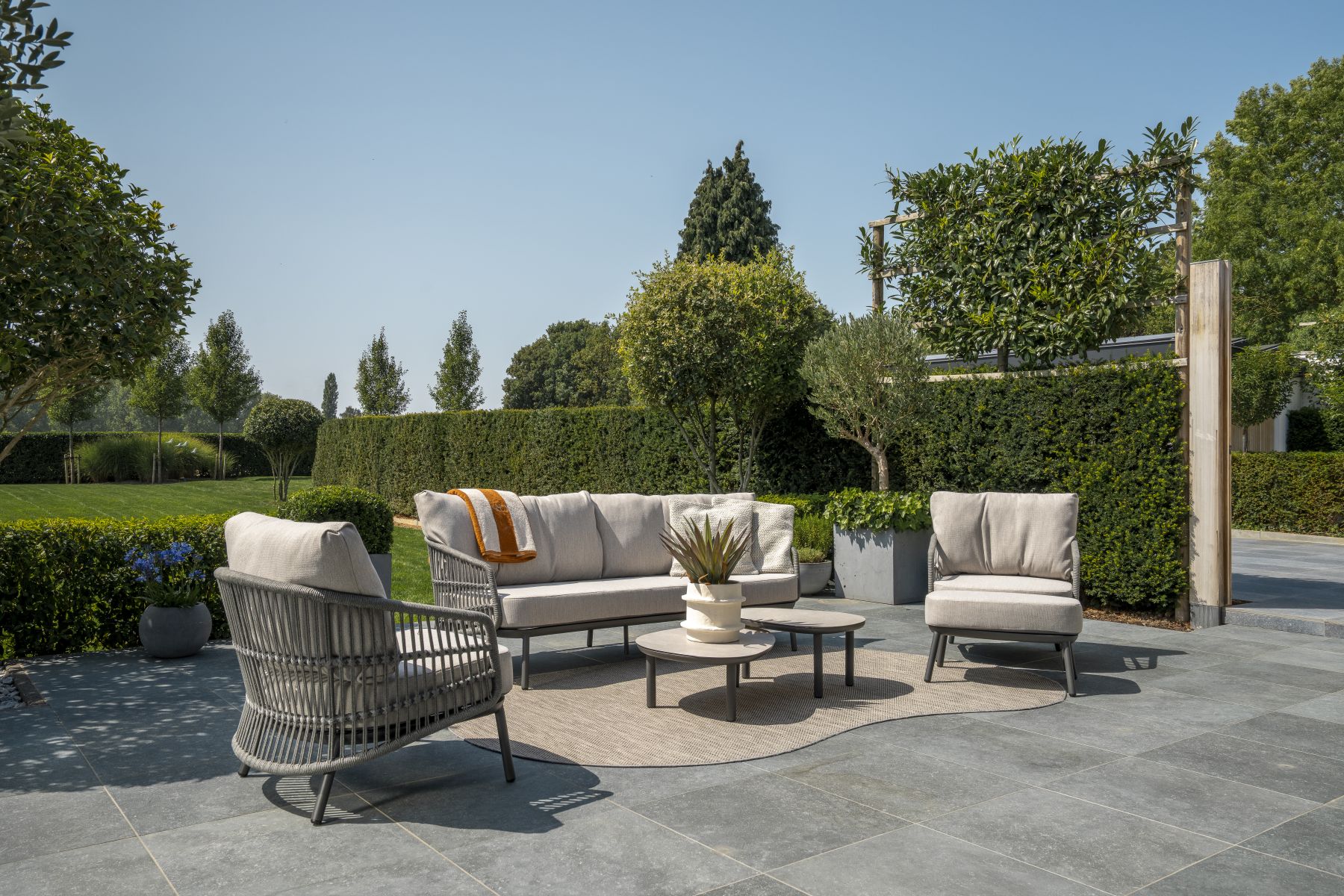 Zestaw Alicante wyróżnia się głębokim siedziskiem (± 73 cm), co pozwala na wygodną pozycję półleżącą. Poduszki wykonano z materiałów typu All Weather.