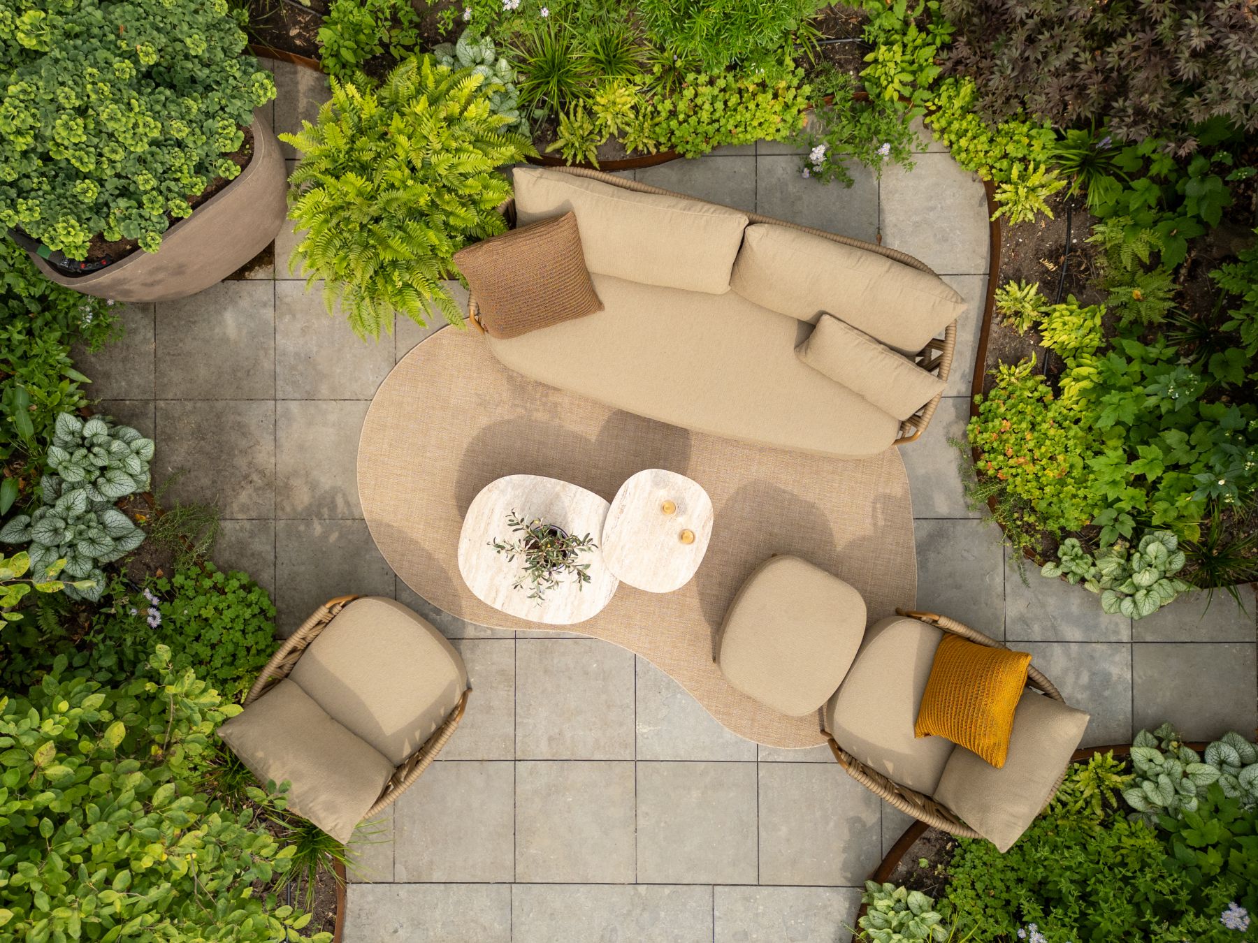 Zestaw wyposażony jest w poduszki z wysokiej jakości tkaniny Olefin o strukturze Bouclé. Materiały te zostały rygorystycznie przetestowane pod kątem wytrzymałości.
