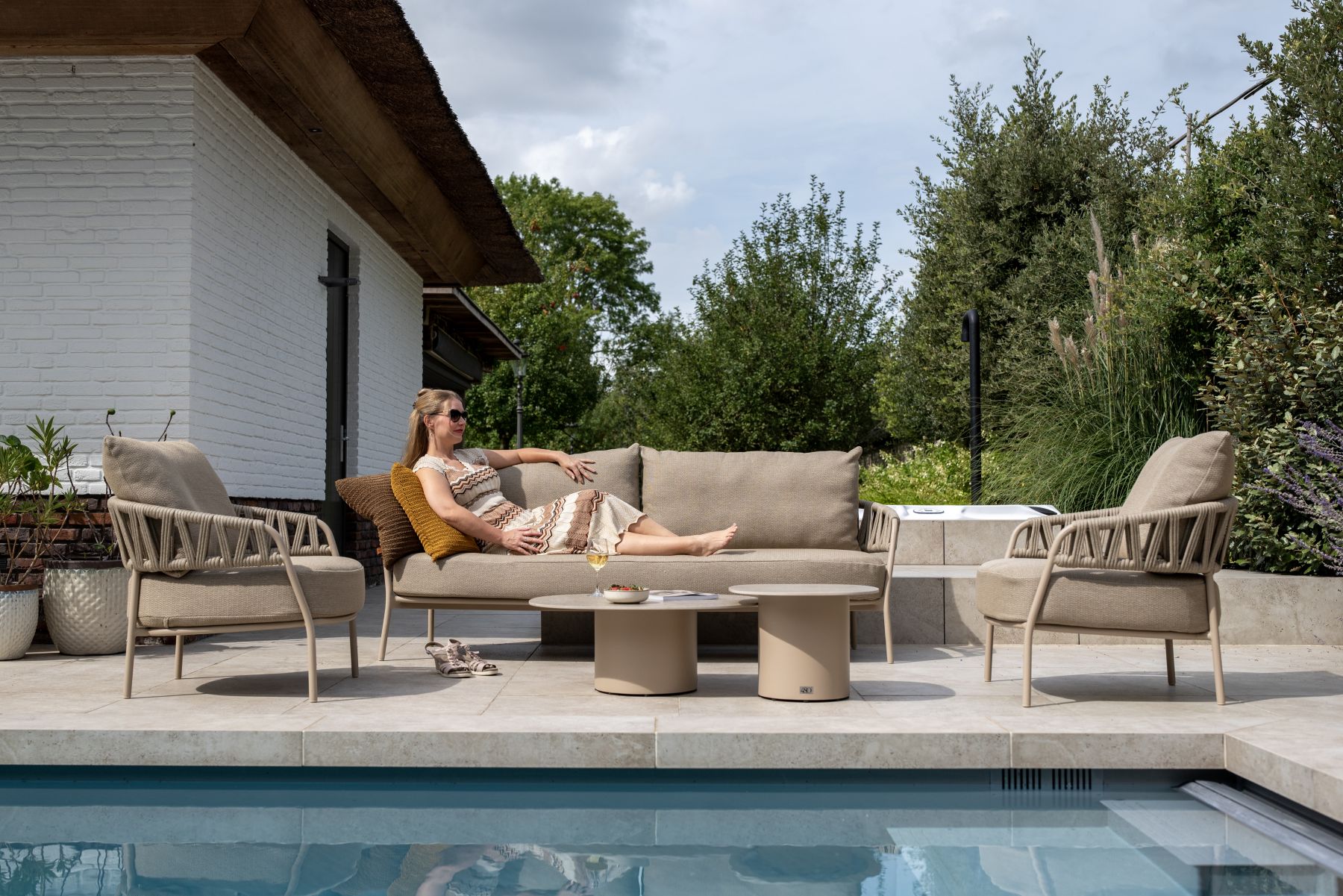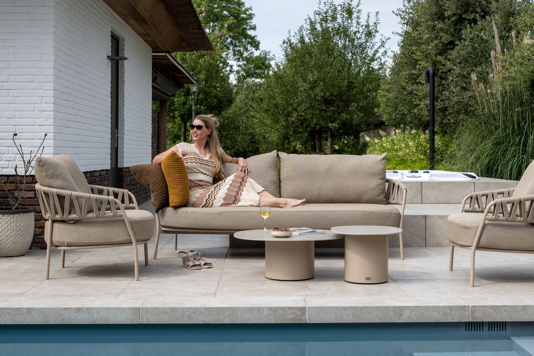 Podstawę mebli stanowi aluminium malowane proszkowo w kolorze Latte. Konstrukcję oparć i podłokietników wykończono splotem linowym (Rope) w kolorze Taupe, który idealnie komponuje się z jasną ramą.