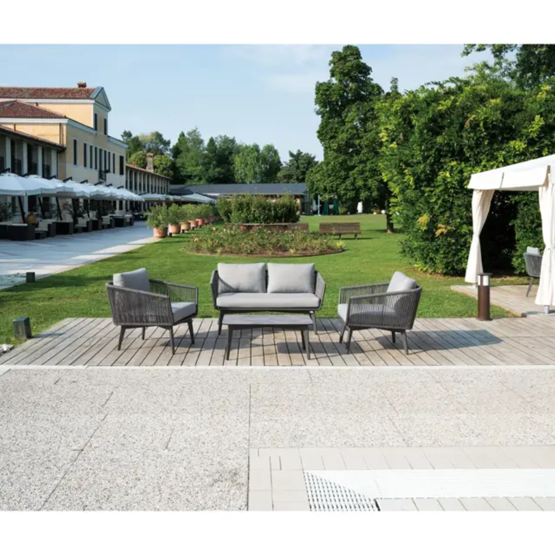 Plecionka: Oparcia są ręcznie wyplatane z syntetycznej liny, co nadaje konstrukcji eleganckiej lekkości i zapewnia trwałość w warunkach zewnętrznych.