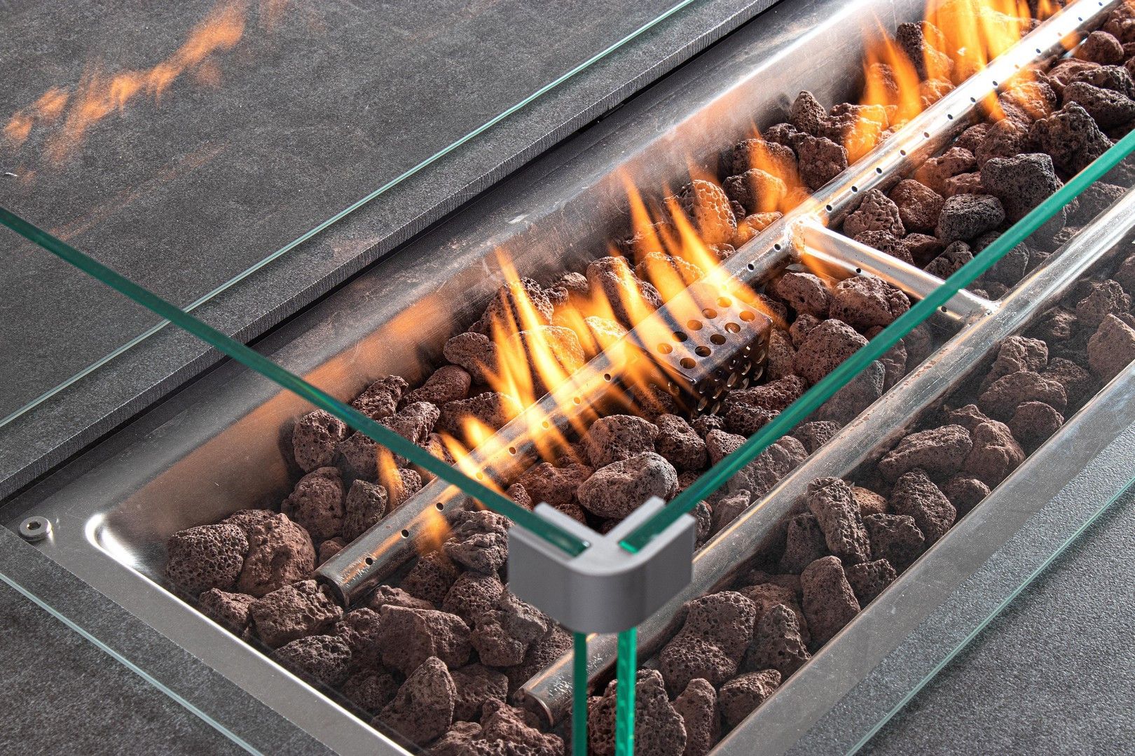 Bezpieczeństwo: Palenisko wyposażono w szybę ochronną z hartowanego szkła oraz aluminiową pokrywę. W zestawie znajdują się kamienie wulkaniczne (rock stones).