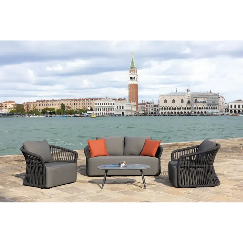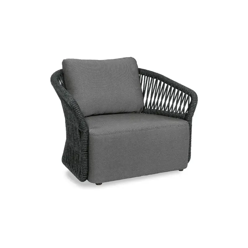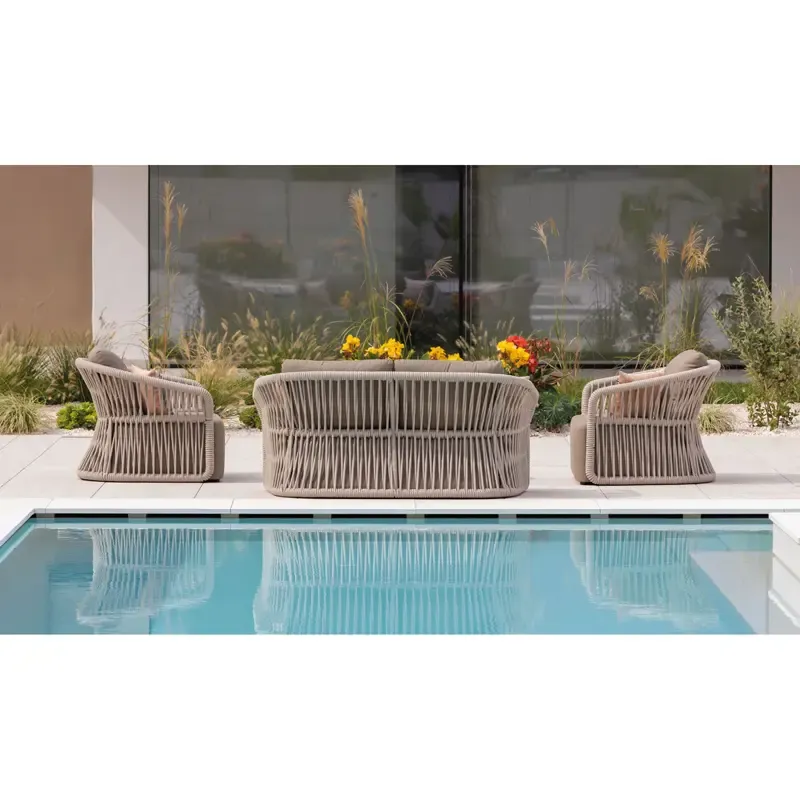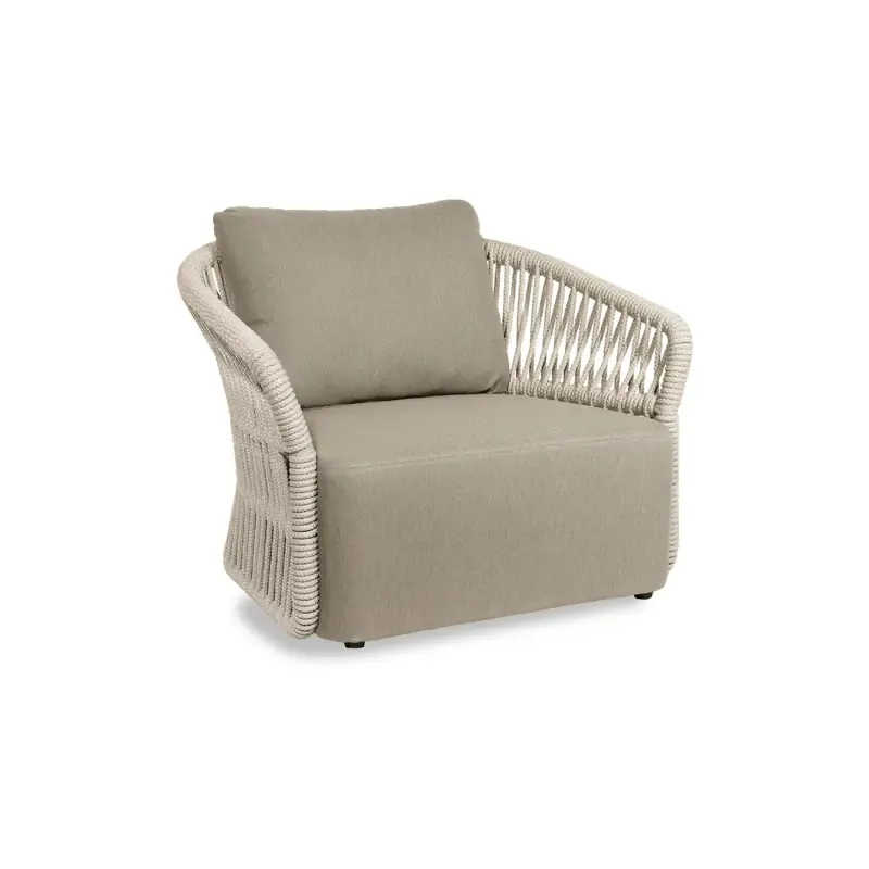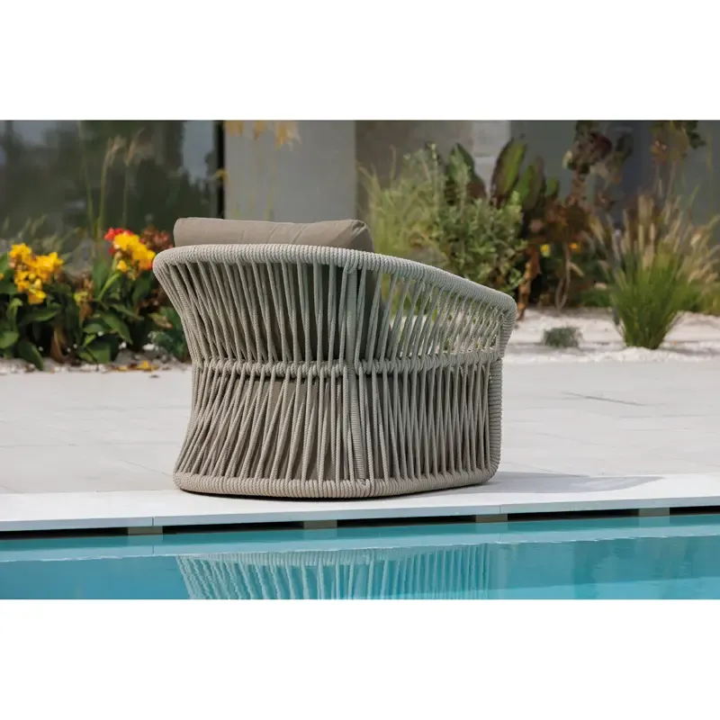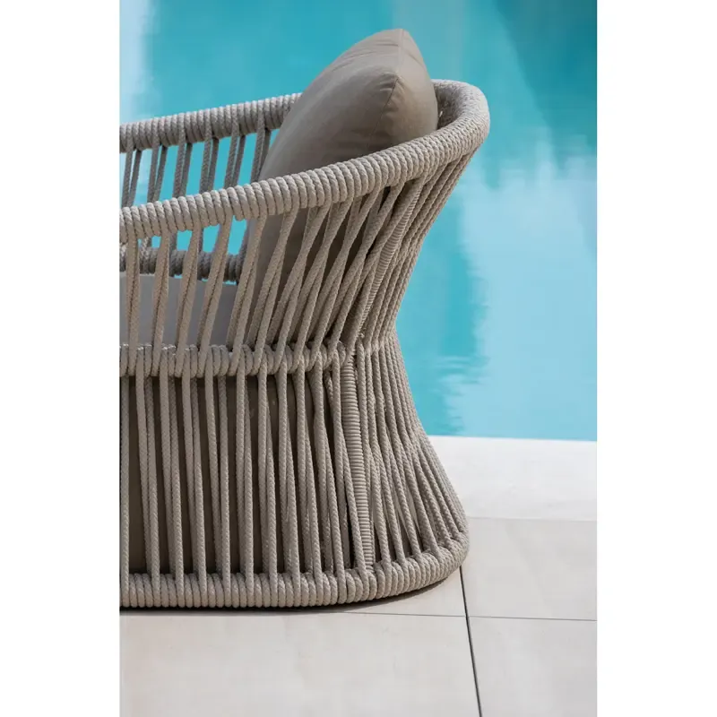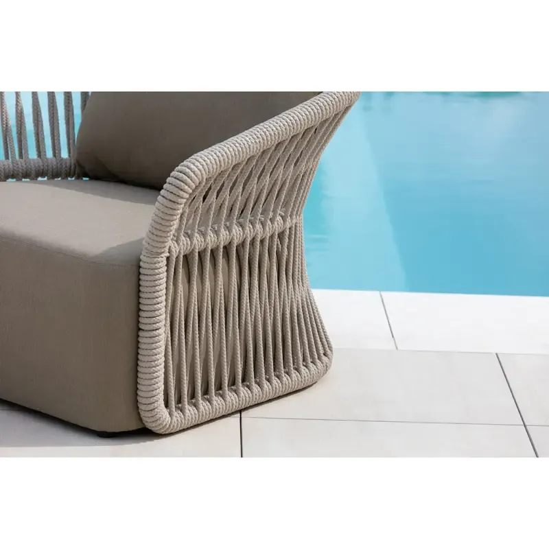 Plecionka (Ręczne Wykonanie): Oparcia foteli i sofy są ręcznie wyplatane z grubej, liny syntetycznej. Lina ta jest odporna na wilgoć i promienie UV.