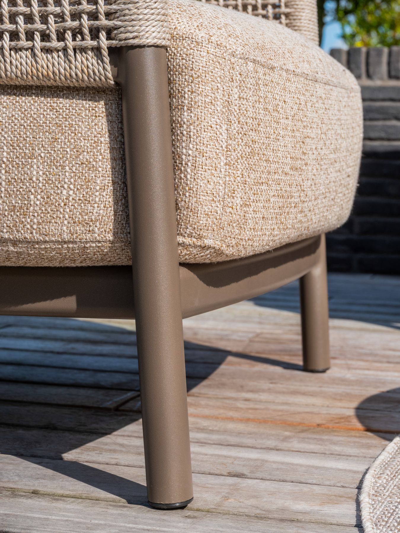 Stelaż mebli wykonano z aluminium malowanego proszkowo w kolorze Terre. Konstrukcję opleciono sznurem (Rope) w kolorze jasnoszarym.