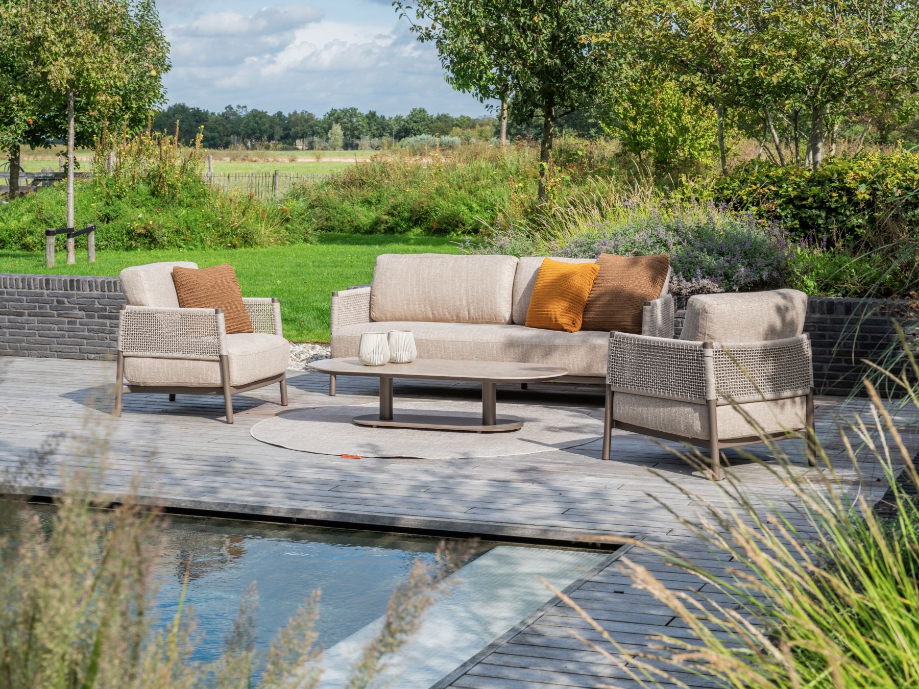 Kolekcja Savanne to balans między nowoczesnym luksusem a naturą. Zestaw wyróżnia się unikalną kolorystyką ramy w odcieniu „Terre” oraz precyzyjnym splotem linowym. Dzięki zastosowaniu materiałów najwyższej klasy, meble są przystosowane do całorocznego użytku zewnętrznego.